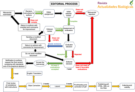 The periodicity of Actualidades Biológicas is continuous, which means that its editorial process shortens the publication times of the articles, favoring their visibility, since each article that arrives to the Journal is reviewed, corrected, diagrammed and published once it completes its rigorous editorial process. Each article, depending on the review process and the timely response of each of the actors involved in the editing process, takes approximately 6 months to be processed.