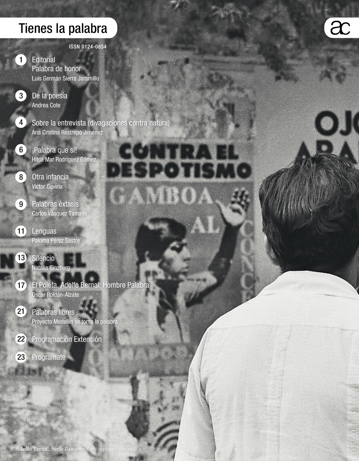 Cuando los artículo o fotografías son extraídos de otras publicaciones, se intenta contactar a los autores para su autorización. En caso de que dicho contacto no resulte posible, se publica el material con base en el artículo 32 de la ley 23 de 1982, dado el carácter académico de la distribución gratuita de la Agenda Cultural.