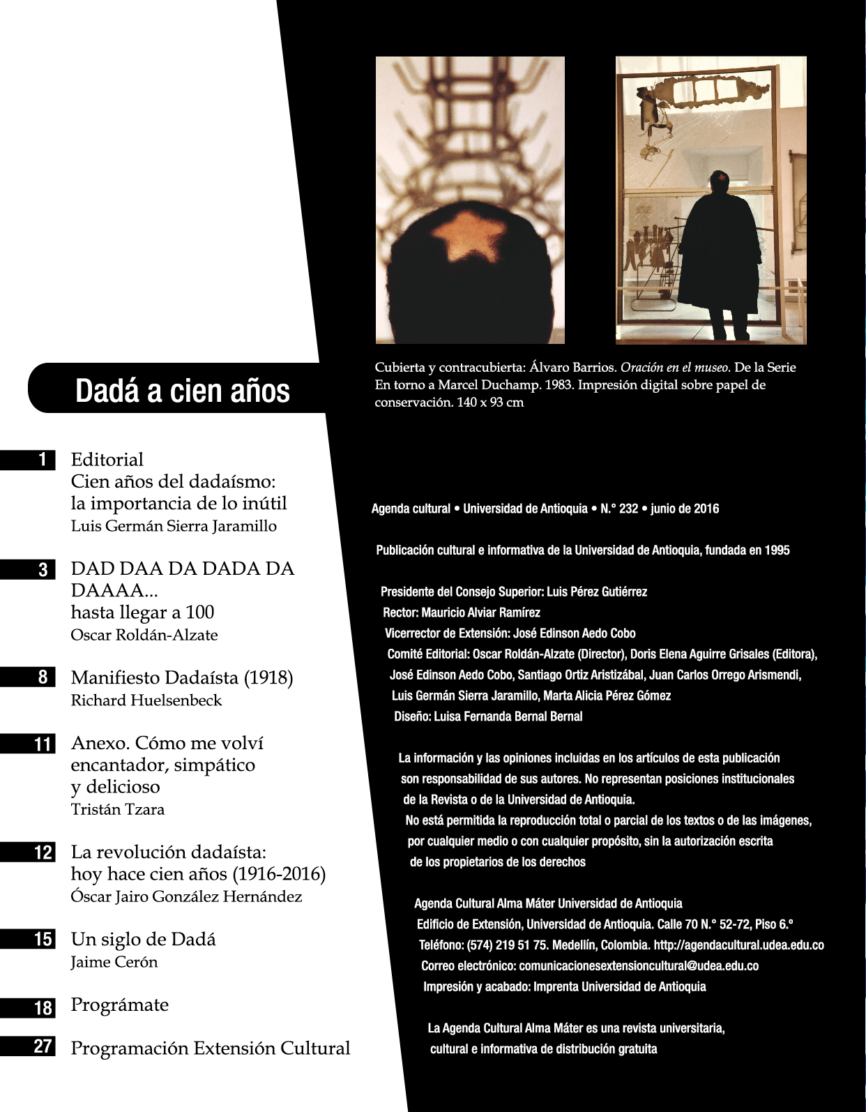 Cuando los artículo o fotografías son extraídos de otras publicaciones, se intenta contactar a los autores para su autorización. En caso de que dicho contacto no resulte posible, se publica el material con base en el artículo 32 de la ley 23 de 1982, dado el carácter académico de la distribución gratuita de la Agenda Cultural.