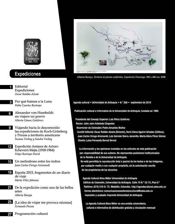 Cuando los artículo o fotografías son extraídos de otras publicaciones, se intenta contactar a los autores para su autorización. En caso de que dicho contacto no resulte posible, se publica el material con base en el artículo 32 de la ley 23 de 1982, dado el carácter académico de la distribución gratuita de la Agenda Cultural.