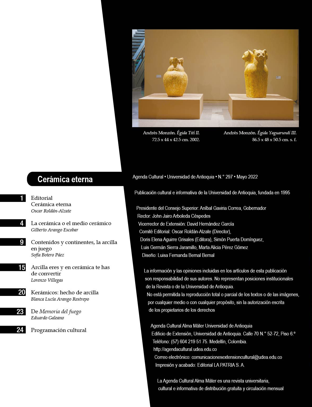 Cuando los artículo o fotografías son extraídos de otras publicaciones, se intenta contactar a los autores para su autorización. En caso de que dicho contacto no resulte posible, se publica el material con base en el artículo 32 de la ley 23 de 1982, dado el carácter académico de la distribución gratuita de la Agenda Cultural.