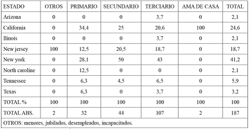 La mayoría de los inmigrantes provenientes de México (62,6%) llegaron a Estados Unidos en la década de los años noventa. Por tanto, no pudieron tener acceso al Programa de Reforma Migratoria de 1986 (IRCA). Dos de cada diez inmigrantes mexicanos, 21,9% del total, son ciudadanos estadounidenses. Esta situación pone a la población mexicana indocumentada en condiciones de extrema vulnerabilidad que permiten su exclusión de los derechos sociales básicos. Sin embargo, los inmigrantes son un elemento central de la economía norteamericana: la Tabla 1 nos muestra el caso de los migrantes originarios de la población de Nexatengo, municipio de Atlixco en su inserción diferenciada a las diversas ramas de la economía. Estados como Nueva York y Nueva Jersey tienen prevalencia en los sectores terciario y secundario; en el caso del estado de California en el sector primario.