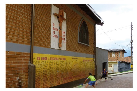 En la construcción participaban jóvenes que hacían parte de las actividades de la iglesia y algunos que pertenecían a los grupos armados, así como familiares de personas asesinadas. Los jóvenes incluyeron en el mural tanto a las personas que murieron asesinadas por los grupos armados como a los propios integrantes de estos grupos. Incluyeron a los perpetradores de los crímenes porque en primer lugar, sus familias llevaron los nombres a la iglesia; en segundo lugar los miembros de los grupos armados que participaron de la elaboración del mural quisieron incluir sus compañeros muertos, sin importar que hicieran parte de las milicias o de los grupos paramilitares.