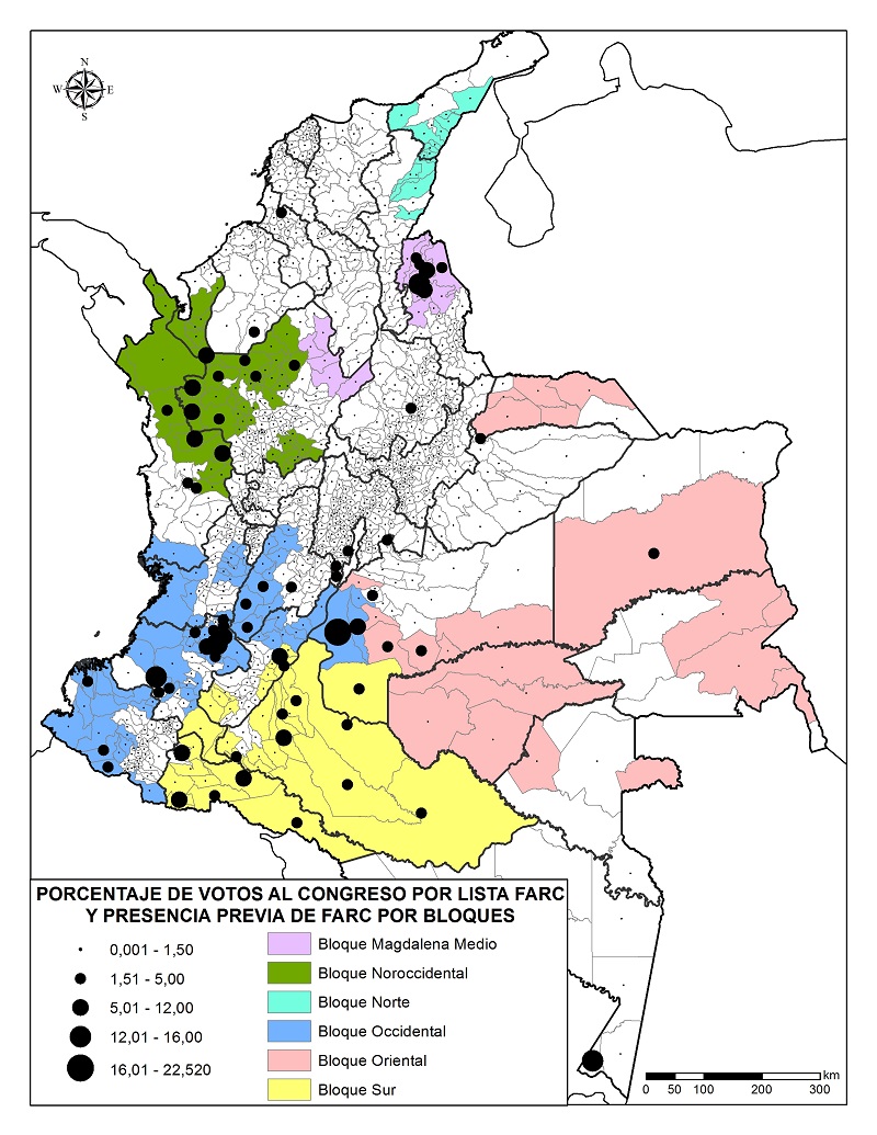 Mapa 1. Votación por partido FARC y presencia de las FARC–EP por bloques.