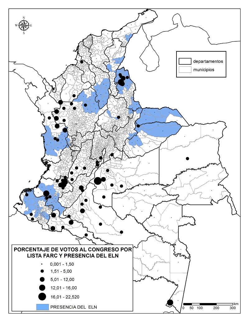 Para empezar, el mapa 2 permite identificar los municipios en los que el ELN ha mantenido una presencia activa y su correspondencia con los escenarios en los que el partido FARC obtuvo diferentes niveles de votación. En el ámbito nacional se evidencia que, de los 119 municipios con influencia de esta guerrilla, 107 registraron votos por el nuevo partido, es decir, 89% de correspondencia. Sin embargo, lo que se observa en el ámbito subnacional es que hay dos escenarios distintos. Mientras que, por un lado, se registran varias zonas de influencia del ELN — Catatumbo, Nariño, Cauca y Chocó— donde el partido FARC logró apoyo electoral y la persistencia de la guerrilla del ELN no configuró un obstáculo para la obtención de votos, de otro lado, en departamentos como Arauca y Casanare, así como en zonas del Bajo Cauca antioqueño y el Sur de Bolívar es evidente la presencia del ELN y una votación nula o escasa por el partido FARC.