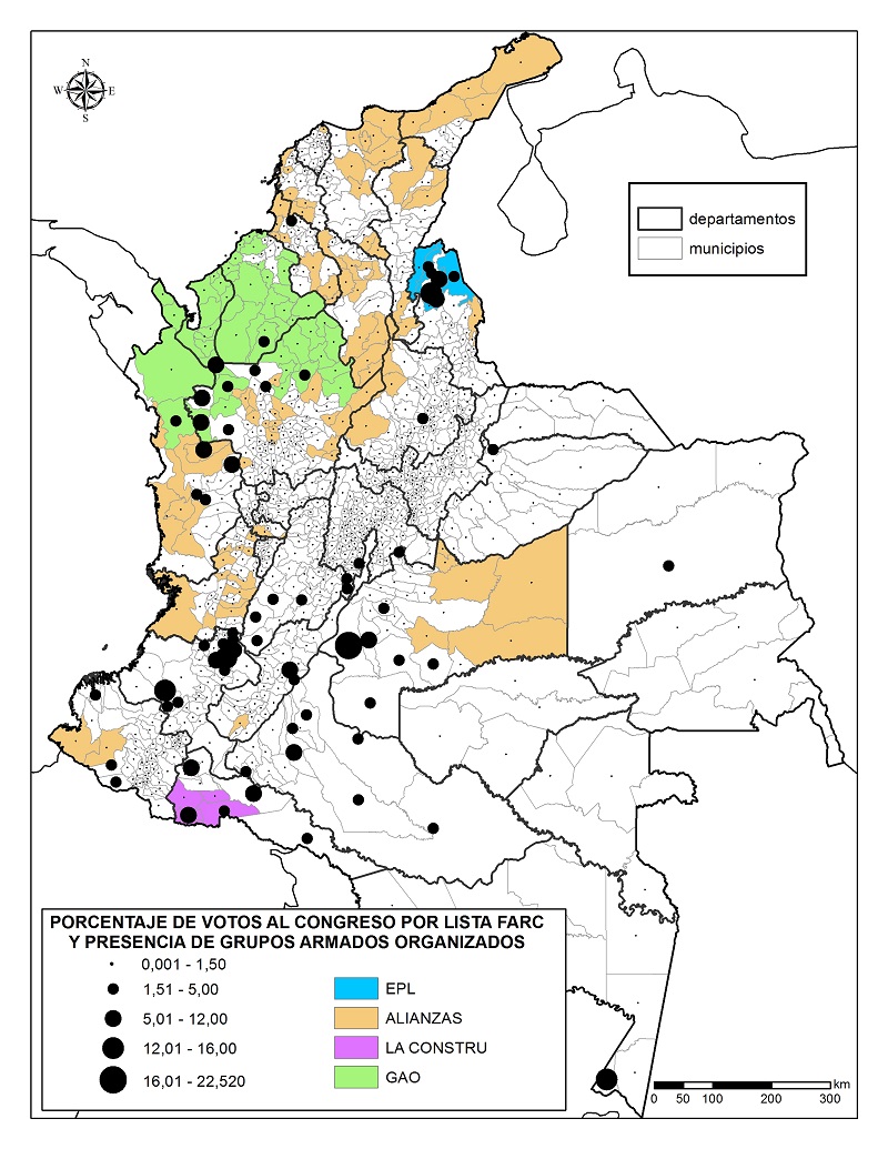 De los 164 municipios con presencia de GAO, 146 registraron votación por el nuevo partido FARC, es decir, en 89% de los casos los GAO no configuraron un obstáculo para el registro de votos por los excombatientes. Es más, en 47,26% de los municipios con presencia de GAO, el nuevo partido obtuvo más de 1,5% de la votación. En el Catatumbo, por ejemplo, a pesar de la presencia del EPL, la FARC logró porcentajes de votación entre 5 y 12% en el ámbito municipal. De manera similar, en el Bajo Putumayo, a pesar de la presencia de la organización La Constru, la FARC alcanzó porcentajes entre 5 y 12% a su favor. Asimismo, en municipios de influencia de las Autodefensas Gaitanistas o Clan del Golfo, ubicados en el Occidente de Antioquia y el Nororiente chocoano, la FARC logró porcentajes de votación de más de 11%. Con base en estos datos, sería discutible que la presencia de grupos armados organizados sea en todos los casos un impedimento para la participación política de la FARC.