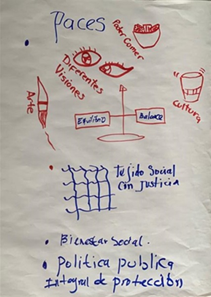 Como se puede apreciar en la imagen, la conceptualización de la paz o las paces para las integrantes del colectivo Cocinando Ideas se configura a través del acceso a los derechos fundamentales, como lo es el derecho a alimentarse, el acceso a derechos de segunda generación, como el arte y la cultura, el bienestar social, el respeto a lo diferente y la justicia que brinde garantías de permanencia en el territorio. Todo ello se encuentra en congruencia con lo planteado por María Sánchez et al. (2021) cuando afirman que la mediación psicosocial se refiere a «conversar —o versar con— y comienza cuando las personas reconocen al otro o a la otra como diferente, pues cada uno tienen una historia de vida, una experiencia cotidiana y relacional que no puede ser igual ni semejante» (p. 98).En definitiva, la construcción de paz y la transición hacia las diferentes paces debe principalmente «desarrollar mecanismos que permitan la expresión legítima y pacífica de todos los sectores» (Arévalo, 2014, p. 144).