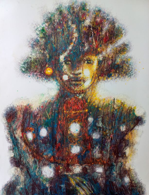 | Artista invitado Juan Fernando Sánchez Suárez De la serie Recién llegados Técnica mixta, acrílico, lapiceros 102 cm x 72 cm 2024 |