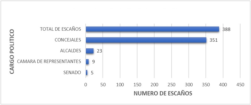 La presencia nacional de las FARC–EP, con sus veintisiete frentes, no impidió tomar una decisión unificada que se formalizó el 18 de mayo de 1985 y sus finalidades medulares giraron en torno a la redistribución de la riqueza, el desmonte del paramilitarismo y la modernización del Estado (Ortiz, 2008). La gran sorpresa se dio un año después en las elecciones de 1986, en las cuales hicieron historia al lograr 388 curules políticas, esto es, la mayor votación para un movimiento de izquierda, resaltando los siguientes cargos: 5 senadores; 9 representantes a la Cámara; 23 alcaldes; 351 concejales; y 18 diputados; para un total de 120 442 votos con listas propias y 198 875 mediante alianzas (Romero, 2011) (véase gráfica 1).