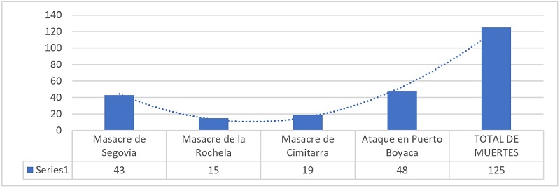 Las zonas de mayor victoria electoral fueron Antioquia, Cauca, Chocó y Arauca. Jaime Pardo Leal obtuvo el tercer puesto en las presidenciales con 10% del electorado nacional (Cajar, 2006, octubre 12). En 1987 fue asesinado por sus denuncias al involucramiento de la fuerza pública en las masacres de Segovia y Remedios, así como por la ocurrencia de crímenes de lesa humanidad contra la UP. Su asesinato fue la respuesta nefasta a su mediática pregunta al gobierno de si tenían o no derecho de vivir en Colombia. En la gráfica 2 se puede observar la violencia sistemática desplegada bajo el modus operandi de masacres, en las que en cuatro de ellas se asesinaron a 125 seres humanos.