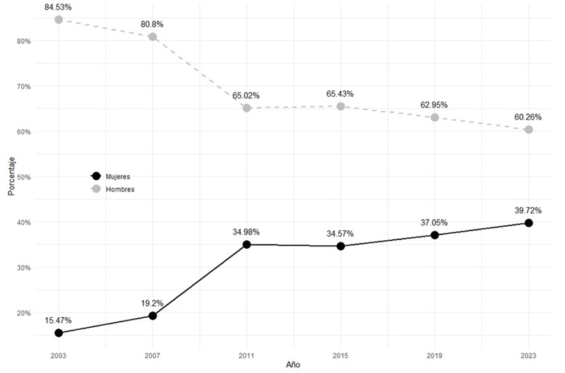 Se analizan las elecciones a Concejo entre 2003 y 2023 por dos razones fundamentales: primero, porque la naturaleza plurinominal de esta corporación permite identificar de manera más fiel el grado de inclusión de las mujeres en los escenarios representativos en el ámbito subnacional; y segundo, porque dicha temporalidad, que tiene como punto de partida la reforma política de 2003, posibilita tener una visión longitudinal de la participación electoral de las mujeres en el territorio.