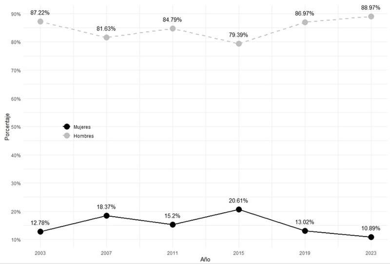 El panorama en términos de la representación política es mucho más adverso para las mujeres. De las 846 curules que han sido provistas entre 2003 y 2023 para 11 municipios de Urabá, 134 han sido ocupadas por mujeres, es decir, 15,83%. La gráfica 2 evidencia la evolución del porcentaje promedio de representación, según el sexo, para las 6 elecciones analizadas. Los datos demuestran que, si bien cada vez se candidatizan más mujeres, esto no refleja un aumento en su representación en los Concejos municipales de Urabá. Paradójicamente, aunque 2023 fue el año que en promedio se presentó el porcentaje más alto de candidaturas mujeres en los últimos veinte años, también fue el año con el porcentaje promedio de representación más bajo, alcanzado sólo 10,69%.