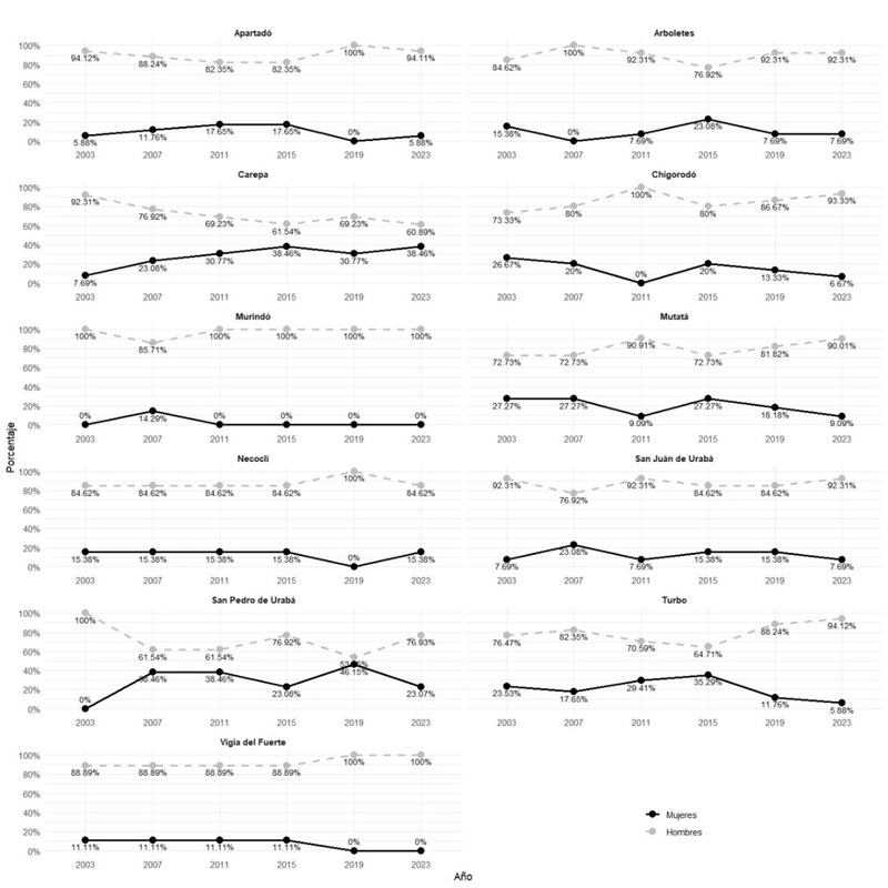Por otro lado, según los datos proporcionados por la Registraduría Nacional del Estado Civil (s. f.), se destacan dos resultados en este territorio: entre 2003 y 2023 el porcentaje promedio de mujeres candidatas a concejales municipales creció, pasando de 15,47% en 2003 a 39,72% en 2023, lo que representa una tasa de crecimiento de más de 100%. Si bien la tendencia en la cantidad de hombres inscritos ha disminuido, se mantiene en niveles superiores a 60%. Ahora bien, respecto al porcentaje promedio de representación efectiva, los hombres electos dominan en más de 70% y las mujeres menos de 25%, lo que demuestra una brecha de género notoria en los escenarios subnacionales de poder. Si este resultado global se desglosa para cada municipio de la subregión, Carepa muestra un mayor crecimiento de representación efectiva de mujeres respecto a los demás municipios.