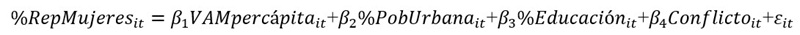 Teniendo en cuenta lo anterior, el marco teórico que guía este artículo establece que poblaciones con mayores ingresos y un grado más alto de urbanización acceden con mayor facilidad a bienes y servicios, y cuentan con más información y tiempo para participar en política, lo que favorece una mayor participación y representación de mujeres en espacios de decisión (Freidenberg y Garrido, 2021; Pachón, Peña y Wills, 2012; Alva, 2017; Hidalgo y Robles, 2020). A su vez, una mayor intensidad del conflicto armado incide negativamente en la llegada de más mujeres a cargos de elección popular (Segato, 2016; Jeffreys, 2008; Andrade et al., 2017), toda vez que se exacerban los modelos patriarcales de dominación, violencia contra sus liderazgos y se agudizan las situaciones de desigualdad hacia ellas, impidiendo así que ocupen de manera más igualitaria los cargos de poder.