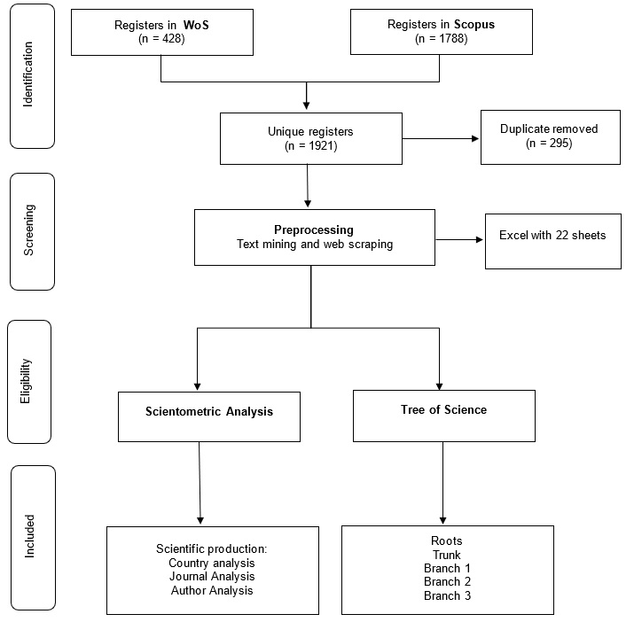 La búsqueda se realizó utilizando las bases de datos de WoS y Scopus. Para analizar publicaciones relevantes se desarrolló un proceso de trabajo cienciométrico detallado y completo. Dentro del campo temático las principales palabras clave de búsqueda fueron «gobernabilidad» y «gobernanza» y las ecuaciones consultadas fueron (ALL (governability) AND ALL (governance)) AND PUBYEAR > 1999 AND PUBYEAR < 2025 AND (LIMIT–TO (SUBJAREA, “SOCI”)) AND (LIMIT–TO (DOCTYPE, “ar”)) y governability (All Fields) and governance (All Fields). Esto condujo a la identificación de 428 registros en WoS y 1788 registros en Scopus; al fusionar los conjuntos de datos, se obtuvieron 1921 registros. La tabla 1 muestra los parámetros de búsquedas utilizados. Los resultados de ambas bases de datos se fusionaron utilizando el paquete Bibliometrix R para la información principal y Tosr para las referencias. El conjunto de datos completo incluyó 1921 registros, dado que se eliminaron 295 publicaciones que eran artículos duplicados y se excluyeron automáticamente los artículos que no estaban directamente relacionados con estos campos, así como aquellos sin investigación original ni datos empíricos. Esta exclusión garantizó que sólo abarcaran publicaciones desde el año 2000 hasta la fecha, lo que permitió obtener patrones, tendencias, comportamiento, avances y contribuciones más actuales sobre gobernabilidad y gobernanza. Esto contribuyó a mantener la relevancia y asegurar que la investigación estuviera directamente relacionada con el campo de estudio.