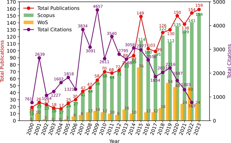 El análisis de la producción científica anual es fundamental para comprender la evolución, las tendencias y el crecimiento exponencial (Dilla Alfonso, 2001) de un área de investigación, mientras que las citas que recibe un artículo indican su preeminencia dentro de la comunidad académica (Grisales, Robledo y Zuluaga, 2023). Contrastar la producción entre bases de datos como WoS y Scopus es crucial para comprender e identificar las ventajas y restricciones de cada una. Este artículo examinó las publicaciones sobre gobernabilidad y gobernanza entre 2000 y 2023, evaluando su impacto a través de citas anuales. Además, se analizó la producción total de ambos conjuntos de datos para identificar las áreas temáticas más prolíficas dentro del campo de investigación.