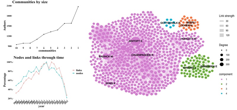 Fase de desarrollo rápido (2009–2021):a partir de 2009 se observó un notable aumento en la cantidad total de publicaciones, así como en las citas, con 1344 publicaciones, lo que representa 71% del total de publicaciones (1904). Las citas también experimentaron un incremento, alcanzando 33 875 citas, lo que representa 65% del total de citaciones. El crecimiento promedio de las publicaciones fue de 5%, y la cantidad total de citas alcanzó su punto máximo durante 2009 (véase gráfica 2). El artículo más citado fue el de los autores Jentoft y Chuenpagdee (2009), el cual aborda los desafíos del sistema de la gobernanza costera y pesquera. Este documento enfatiza que los límites de la gobernabilidad están determinados tanto por la naturaleza del sistema como del problema que dicho sistema debe afrontar, lo que subraya la necesidad de examinar su gobernabilidad (Jäntti, Paananen, Kork y Kurkela, 2023).