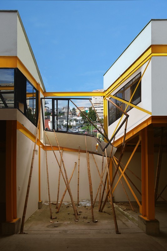 | Artista invitado Mauricio Cardona Rivera De construcciones innecesarias (colapso contenido I) Instalación con metal, vidrio, guadua y caña brava 6 m x 10 m x 3.70 m 2007 |