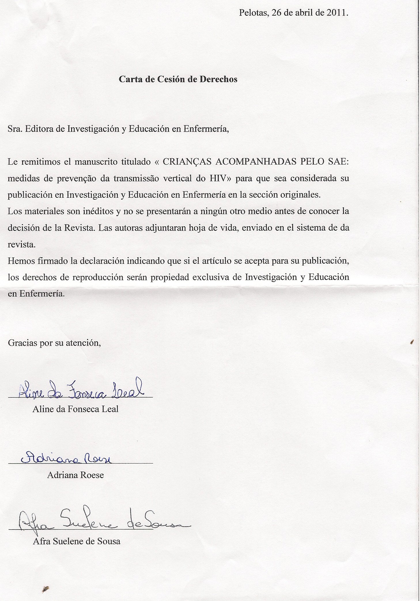 English: If the article is accepted for publication, all copyright will be of exclusive property of Investigación y Educación en Enfermería. The text and the graphics included in the publication are exclusive responsibility of the authors and not necessarily reflect the thought of the Editorial Committee.