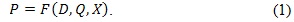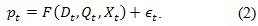 Sea p el precio de la energía eléctrica, desde el punto de vista estrictamente económico, este precio es una función de la cantidad de energía demandada, D, y de la cantidad ofrecida de bienes y servicios en la economía, Q, y de otras características del sector eléctrico y de la economía en general, las cuales se denotan por, X, en consecuencia, se puede definir la función inversa de demanda3 F como:
