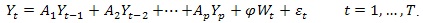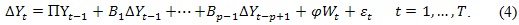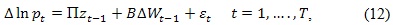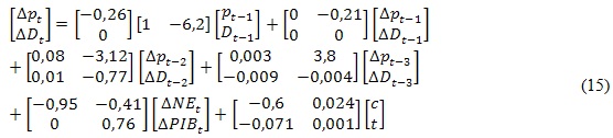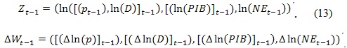 Donde Π es la matriz de relaciones cointegrantes de largo plazo, Bφ son vectores de parámetros de los retardos del precio de la energía respectivamente, φ es la matriz de parámetros asociadas a las variables exógenas como constantes, tendencias, variables binarias, etc.