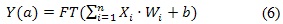 Una red neuronal está conformada por varios elementos denominados neuronas, las cuales se encargan de procesar la información de entrada con el fin de producir un estímulo o salida (mapeo no lineal entre las entradas y salidas de un sistema determinado), una representación matemática de una neurona es mostrada en el Gráfico 1, este es el modelo propuesto por McCullogh-Pitts, el cual consta de unas entradas (Xi), una función de activación (función de transferencia FT), unos pesos (Wi) asociados a cada entrada, un offset o bias (b) y la salida de la red (Y), estos parámetros se relacionan a través de la expresión (6):