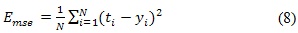 Una vez seleccionado el número de capas, las funciones de activación de las neuronas de cada capa, las bias (bi) y los pesos de la RNA (Wi), son los parámetros que se deben de ajustar con el fin de obtener la respuesta deseada (Target), el ajuste de estos parámetros se logra a través del entrenamiento de la red, proceso en el cual la red aprende de la información suministrada, en este proceso se minimiza el error entre la salida de la RNA (yi) y el valor deseado (ti). Una métrica que permite observar el ajuste de estos parámetros, es el error medio cuadrático, dado por la expresión (8).