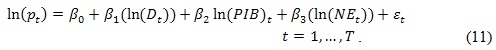 En este orden de ideas, la relación empírica a analizar y sobre la que se basan las proyecciones de precios de energía y las conjeturas sobre el comportamiento futuro, está dada por la siguiente expresión: