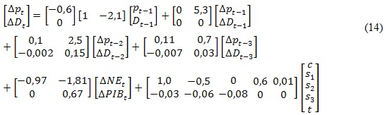 Una manera alternativa, y más completa, para analizar el comportamiento de los precios en el largo plazo es usar un vector de corrección de error-VEC con p retardos de la variable dependiente (la longitud del retardo se contrasta sobre la base de un VAR, a través criterios estadísticos como el de Schwartz o Akaike), el cual adopta la siguiente forma: