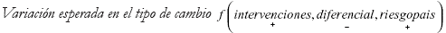 Siendo Int una medida para las intervenciones del banco y los parámetros α,β,δ>0significan la respuesta relativa de la tasa de cambio ante variaciones en cada una de las variables explicativas.25 Nótese que la ecuación (4) tiene propiedades de identidad, en cambio, esta nueva ecuación (5) le imprime una importancia directa a las intervenciones so pena de cambiar el efecto relativo del diferencial de intereses y de la prima de riesgo.