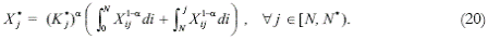 Let us examine now the technologies of the North. Equation (20) is the production function of the j-th good produced by the North (X* j), which uses as factors of production capital (K* j), the intermediate goods supplied by the South (those with backward technological integration from 0 to N), and the intermediate goods produced by the North itself (those with backward technological integration from N to j)