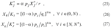 Since the technology is analogous to the closed economy case, the country's capital is homogeneously distributed among the N sectors of activity: Kj = K/N. It is also easily deduced that factor and input coefficients are fixed. Hence, the gross output of good j is deduced by using the equivalent equation (8):