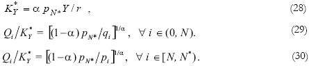 The world capital is simply the sum of Southern and Northern capitals: K+K*. If the factor price equalization theorem holds, the allocation of the world capital follows the pattern determined by equations (14) and (15); i.e., the final good activity demands a fraction α of the world capital: KY = α (K+K*), and the remainder is evenly distributed among the intermediate-good sectors: Kj= (1– α) (K+K*)/N*, ∀j ∈ (0, N*).