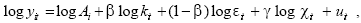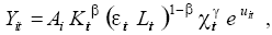 where Yit is output in the i-th country at time t, Ai is a fixed country effect, Kit is capital in the i-th country at time t, εitLit is the human capital level in the i-th country at time t (where ε is a measure of average schooling, and L is the labour force size), Χit is the degree of technological integration in the i-th country at time t, and exp(uit) is the error term. The coefficient β is assumed to be a constant positive fraction, and γ measures the output elasticity of technological integration on productivity.