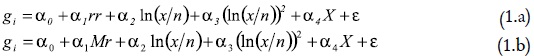 In case (1.a), gi is the participation of spending in item i (namely education, health, consumption or investment) in total spending; rr is a dummy per household standing for whether or not it receives international remittances, our treatment variable; x corresponds to the total spending, n to the total numbers of persons that conform the household, ln(x/n) is the natural logarithm of the per capita expenditure, a variable that is also included in its square form in order to accomplish a better adjustment of the regression.