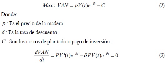 En este sentido, si el término de la izquierda de esta ecuación (6) es mayor que el de la derecha, la decisión es conservar el bosque por un período adicional. Es decir, cuando el beneficio sea mayor que los costos representados en el término de la derecha. Si ambos son iguales, la decisión sería indiferente.