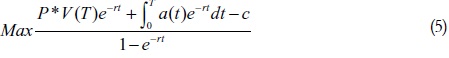 En este sentido, y en un horizonte de largo plazo, para múltiples rotaciones la función de maximización estaría dada por la ecuación (5) la cual recoge en la integral de 0 a T, la suma acumulada de los otros beneficios derivados del bosque y diferentes de la madera y representados por a(t), descontados a la tasa de descuento e-rt. Para la estimación de a(t) se presentan bastantes dificultades de información y también de metodologías para la valoración de los otros servicios ambientales que prestan los bosques. El alcance de este artículo no permite avanzar en el tema de la valoración como para incluir el término a(t) en la función de maximización. Sin embargo, es importante que el lector comprenda que en las decisiones sobre el manejo forestal habría una diferencia significativa cuando se logran incluir todos los servicios derivados del bosque y que aquí representamos por el término a(t). En otras palabras, mientras más beneficios se obtengan del bosque, los cuales dependen del tiempo, entonces la decisión de cortar o conservar se va a ver afectada a favor de la conservación del bosque. Nuevamente, esto dependerá de la valoración económica que se haga de los demás beneficios del bosque.