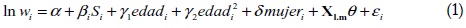 donde wi son los salarios de los trabajadores, Si es el nivel de educación superior alcanzado entonces, β es interpretado como el retorno a la educación, edadi es la edad de las personas, mujer es una dummy por género. Uno de los objetivos del trabajo es observar como la obtención de un diploma determinado o la elección del lugar de estudio afecta la rentabilidad de la educación, por esta razón son involucradas algunas características de las instituciones de educación superior en el vector Xl,m (la cuales son: ¿a cuál institución de educación superior asistió?, el área de conocimiento que cursó y si la institución de educación superior es pública o privada). Adicionalmente el vector Xl,m contiene una dummy asociada a las áreas de conocimientos de los estudios cursados: agronomía, veterinaria y afines, bellas artes, ciencias de la educación, ciencias de la salud, ciencias sociales y humanas, economía, administración, contaduría y afines, ingeniería, arquitectura, urbanismo y afines, y matemáticas y ciencias naturales.