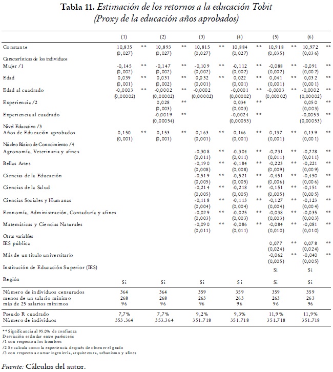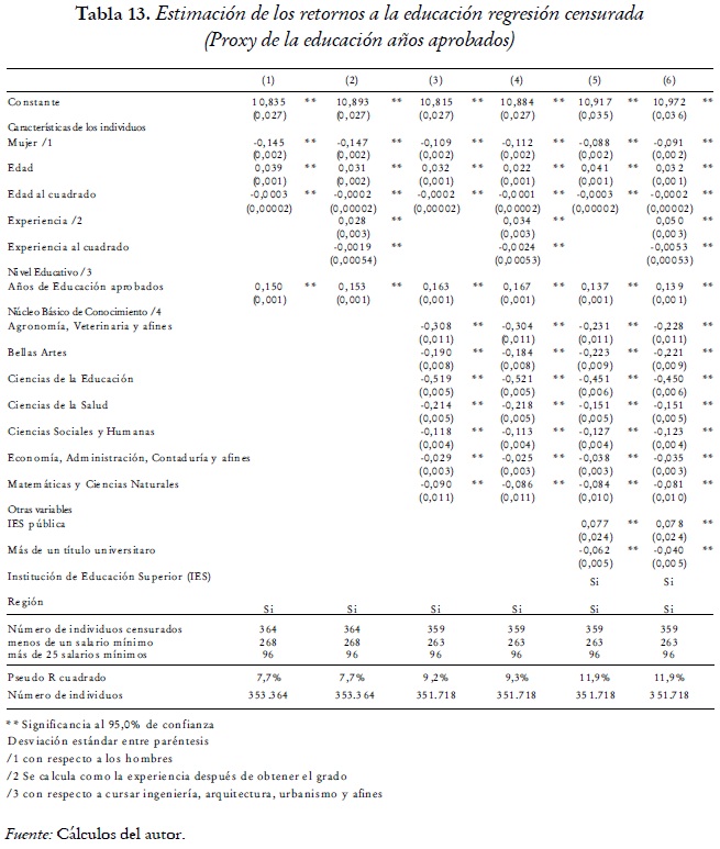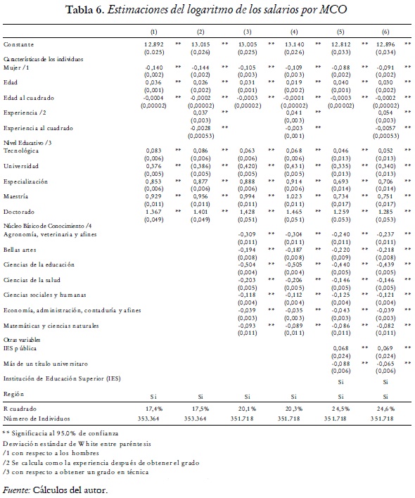 Teniendo en cuenta estos problemas se procede a analizar los resultados de las estimaciones. Los signos de las características de los individuos son los esperados, esto es, la edad tiene un efecto positivo pero decreciente. De otra parte, la experiencia del individuo fue aproximado por la edad, ya que no hay cálculo de los años cursados. Entonces el efecto marginal de la experiencia es constante a través de las diferentes especificaciones y se encuentra alrededor del 1,5% por cada año adicional (tabla 7).