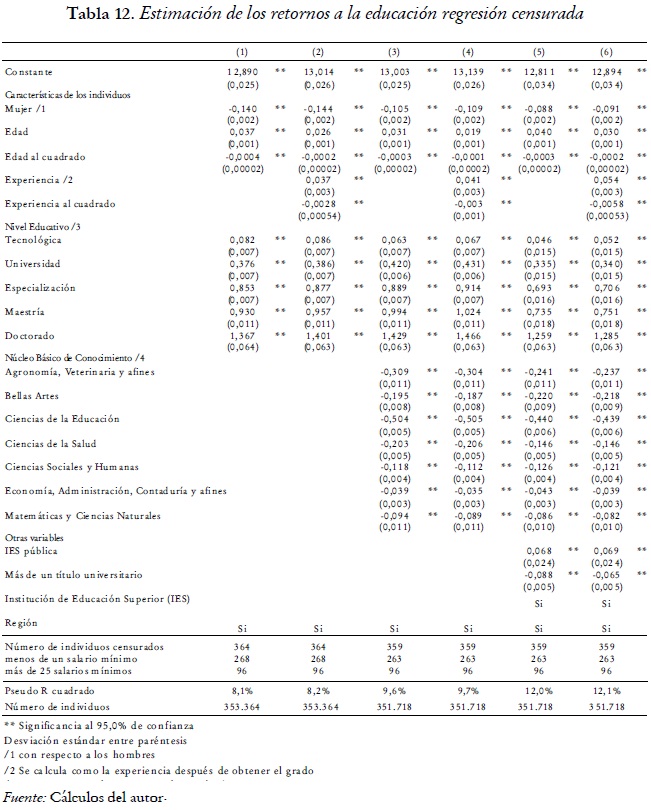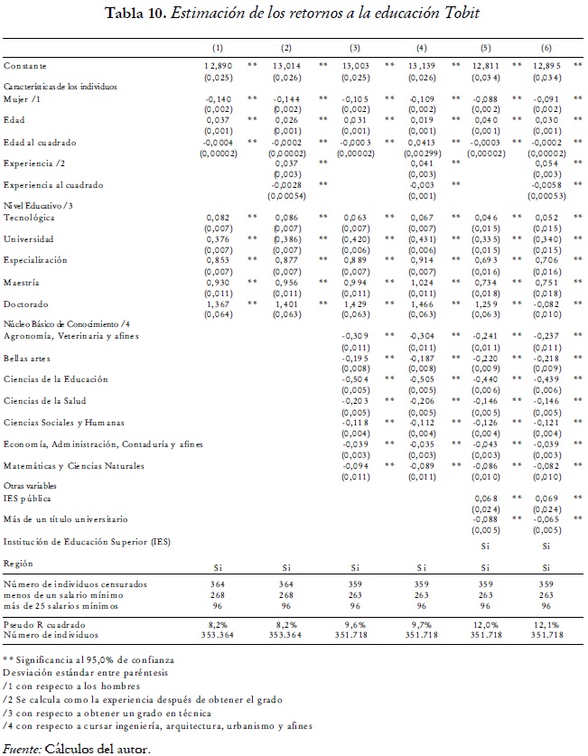 Los resultados de las estimaciones aparecen en la tabla 6. Sin embargo, es importante tener en cuenta que hay un problema de censuramiento en los ingresos, ya que como se mencionó, el IBC no puede ser menor a un salario mínimo y mayor que 25 salarios mínimos. Entonces se optó por estimar los coeficientes a través de un modelo Tobit y por regresiones censuradas (véase Apéndice 1, tabla 10 a tabla 13). Ahora bien, sólo se censuró el 0,1% de la muestra, entonces los coeficientes sólo cambian a partir del tercer o cuarto decimal y siguen siendo significativos al 95,0%, por tanto se hicieron todos los cálculos a partir de los coeficientes estimados mediante Mínimos Cuadrados Ordinarios.