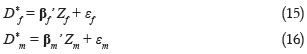 donde Zf y Zm contiene el conjunto de características personales de los integrantes de la unidad familiar considerada, que pueden ser comunes entre las ecuaciones; εf y εm son perturbaciones aleatorias que recogen los efectos inobservables. Si se supone que dichas perturbaciones siguen distribuciones normales estándar independientes, los vectores de parámetros βf y βm pueden estimarse de un modo consistente y eficiente por separado mediante dos probits univariantes. Sin embargo, igual que hay elementos comunes entre los regresores observables de ambas ecuaciones, cabe pensar que los elementos inobservables que afectan la decisión de participar del marido y su esposa pueden estar correlacionados. Si esto es así, los parámetros de las ecuaciones serían ineficientes (Zellner y Huang, 1962).