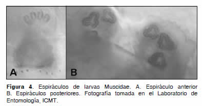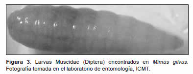 De los insectos, el orden Phthiraptera presentó la mayor diversidad, con 18 especies, todas pertenecientes al grupo Mallophaga (Figura 1 y Figura 2). Del orden Diptera se identificó una especie y diez larvas de la familia Muscidae (Figura 3 y Figura 4). De los ácaros se identificaron tres géneros, de los subórdenes: Astigmata y esostigmata, pertenecientes al orden Parasitiformes (Figura 5 y Figura 6). En cuatro ácaros de la familia Laelapidae no fue posible la clasificación taxonómica hasta el nivel de especie.
