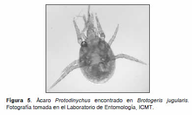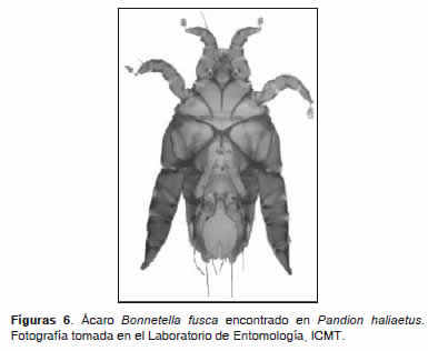 De las especies de ectoparásitos encontrados en este estudio, Aquiligogus maculatus hallado en Milvago chimachima había sido registrada para esta ave en Colombia (San-Martín et al., 2005). Además se ha encontrado en traros (Polyborus p. plancus) y en tiuques de Argentina, Brasil y Chile (Valente et al., 2001; González-Acuña et al., 2004; San-Martín et al., 2005). Al contrario de los Phthiraptera, los ácaros ocupan una diversa variedad de nichos y hospedadores (Proctor y Owens, 2000). La mayor diversidad de ácaros de las aves se encuentra en la super! cie de las plumas, aunque algunos se encuentran en el cálamo de estas (Miller, 1997). La especie de ácaro B. fusca ya había sido registrada para Pandion haliaetus, además de otras especies como Analloptes buettikeri, Analloptes sp., Myialges caulotoon y Ornithonyssus sylviarum (Philips, 2000; San-Martín et al., 2005; Soto Piñeiro et al., 2007). Según Atyeo y Gaud (1981) los ácaros del género Bonnetella están restringidos a aves de la especie Pandion haliaetus. Sin embargo, en este estudio fue encontrado en un tucán Ramphastos citroelaemus. En aves del género Otus se han registrado las siguientes especies de ácaros: Myialges spp., Blankaartia sp., Dermonoton sp., Leptotrombidium, Ornithonyssus y Toritrombicula, entre otros (Philips, 2000).