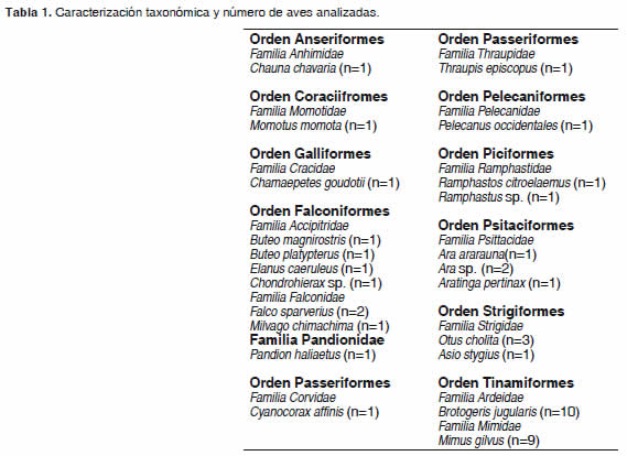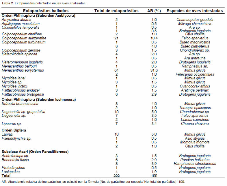 Se analizaron en total 43 aves, pertenecientes a 10 órdenes y 14 familias (Tabla 1), a las cuales se les colectaron 202 ectoparásitos, distribuidos en insectos de los órdenes Pthiraptera y Diptera y ácaros del orden Parasitiformes (Tabla 2).