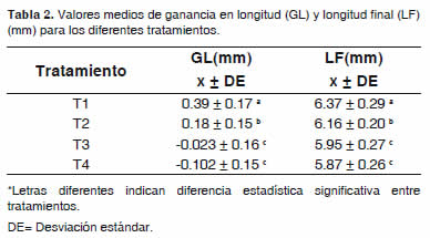 respectivamente) y ganancia de longitud (0.39 ± 0.17a; 0.18 ± 0.15b; -0.023 ± 0.16c; -0.102 ± 0.15c mm, respectivamente). El T1 presentó los mejores resultados, seguido por T2. El porcentaje de sobrevivencia no tuvo diferencia estadística significativa entre tratamientos.