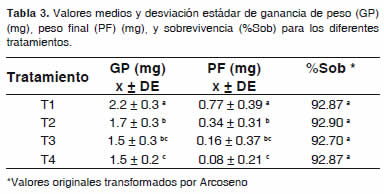 Resultados similares fueron obtenidos para peso final (PF), registrándose el mayor peso en T1 (2.2 ±0.3 mg) observándose diferencia significativa con T2, T3 y T4 (p<0.05). Seguido por T2 (1.7 ± 0.3 mg) encontrándose diferencia significativa respecto a T1 y T4 (p<0.05) pero sin diferencia significativa con T3 (p<0.05). El tercer tratamiento (T3) no tuvo diferencia significativa en comparación con T4. Pero sí con el resto de los tratamientos (p<0.05). T4 arrojó iguales resultados a T3 en cuanto diferencias estadísticas en comparación con los demás tratamientos. La mayor ganancia de peso fue obtenida con T1 (0.77 ± 0.39 mg.), con diferencia significativa respecto a los otros tratamientos (p<0.05), seguida por T2 (0.34 ± 0.31 mg.) el cual no tuvo diferencia significativa con T3 (p>0.05) (0.16 ± 0.37 mg.), pero si con T4 (p<0.05) (0.08 ± 0.21 mg). No se encontró diferencia significativa entre T3 y T4 (p>0.05) (Tabla 3); en relación al porcentaje de sobrevivencia (% sob), para ninguno de los tratamientos se encontró diferencia estadística (Tabla 3).