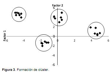 18. Se emplea para agrupar las unidades experimentales en subgrupos, de tal manera que exista homogeneidad al interior de cada clúster (Figura 3). El análisis de componentes principales es un criterio fundamental para hacer conjeturas sobre el número de factores que se deben determinar en el análisis factorial y para probar si, en realidad, un grupo de variables p > 2 cae dentro de un espacio de dos o tres dimensiones que permita ser observado dentro del análisis de clúster (Cuadras, 2010).