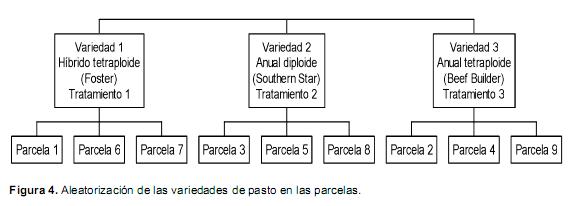 Las tres variedades de pasto, correspondientes a un híbrido tetraploide (Foster), un anual diploide parcelas/variedad), de acuerdo con el esquema que se presenta en la figura 4.