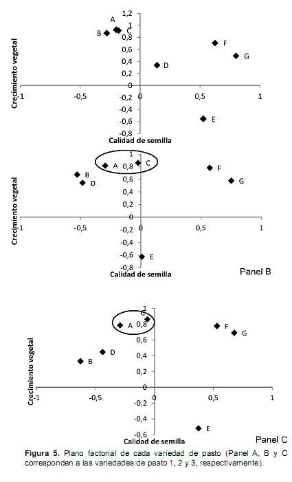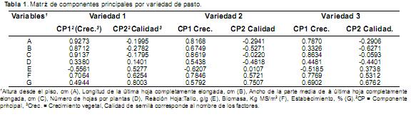 El primer componente principal (crecimiento vegetal) fue el que reunió la mayor proporción de la variabilidad original, representada en todas las variedades de pasto por tres variables en común, a saber, altura desde el piso (A), ancho de la parte media de la última hoja completamente elongada (C) y biomasa (F), que fueron las de mayor coeficiente factorial. El segundo componente principal (calidad de la semilla) aglutinó la variación no reunida por el primero, con una única variable original (porcentaje de germinación) presentando los mayores coeficientes factoriales. En el análisis de componentes principales, los nuevos factores (o componentes) forman un ángulo de 90 grados y deben ser independientes entre sí; esto es, una variable debe tener coeficientes elevados con un sólo factor y no deben existir factores con coeficientes similares.