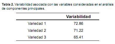 En la tabla 1 se muestran los dos primeros componentes principales por cada tipo de variedad, destacándose que las variables que definen el factor principal para las tres variedades fueron básicamente: Altura desde el piso, ancho de la parte media de la última hoja completamente elongada y biomasa. El componente principal dos se define básicamente a través de la variable porcentaje de establecimiento.
